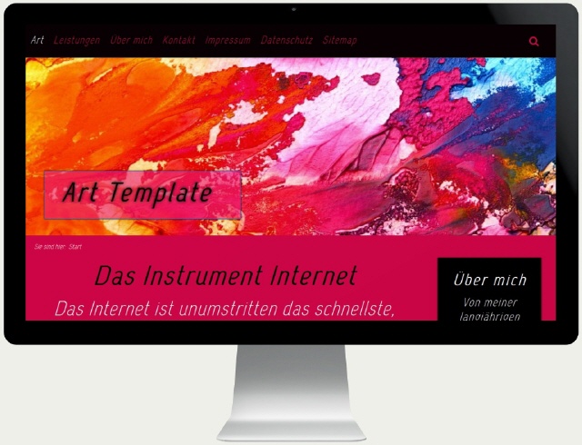 Das Art Template hat einen großen Eyecatcher, der linksseitig mit einer H1 Überschrift beginnt. Die Seite beginnt mit einer drei Ebenen CSS3 Sticky Navigation mit einer Suchen - Funktion auf der rechten Seite, die bei Gebrauch von oben als Box eingezoom wird. Die Navigation wird bei dynamischer Darstellung auf allen Geräten immer oberhalb der Site eingeblendet und als Mobile Navigation beim Tablet und Smartphone umgewandelt. Darunter schließt der Eyecatcher, samt H1 Überschrift an, im Content ist als erstes eine, "Sie sind hier" Leiste angebracht.