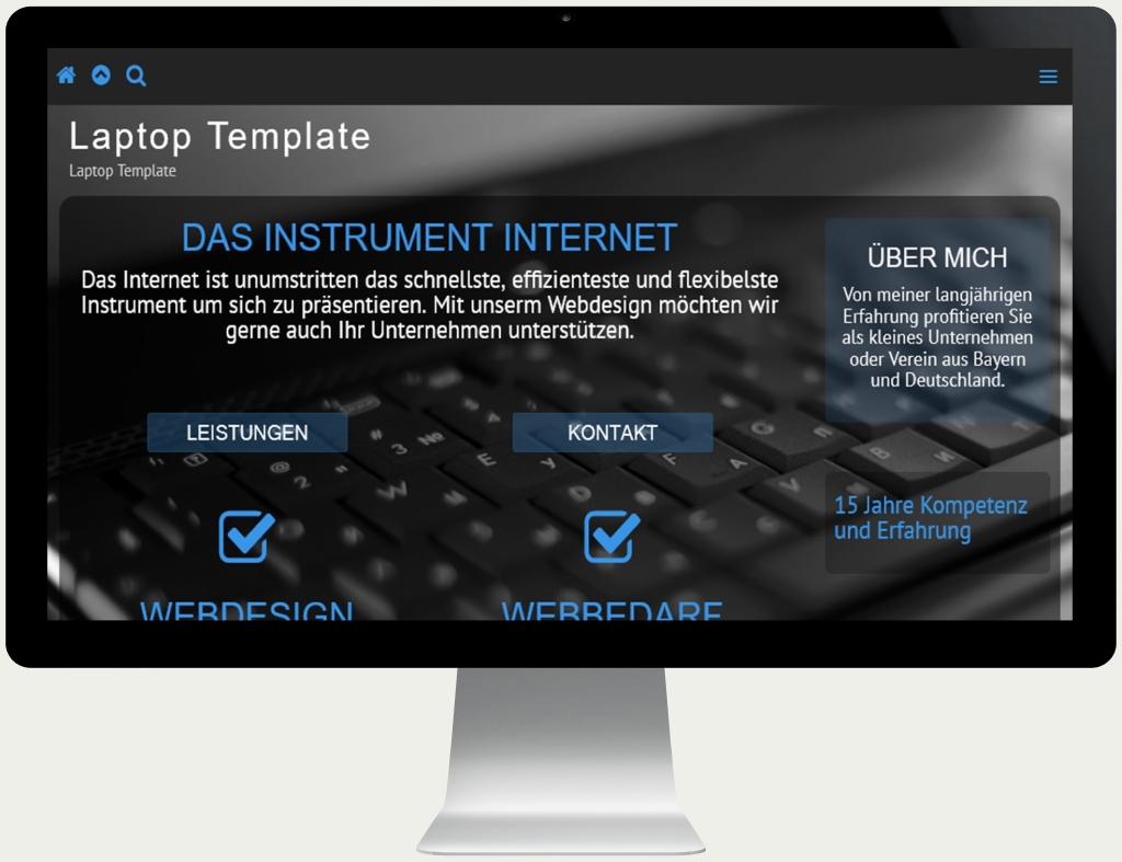Das Laptop Template ist in dunkelgrau und leicht transparent gehalten. Die Schriftfarbe ist weiß, die Überschriften und verschiedene Modulbereiche sind in einem Blauton abgesetzt. Das Laptop Template hat keinen Eyecatcher, somit bleibt mehr Platz für den Hauptteil der Seite. Das Template startet mit einer drei Ebenen Sticky CSS3 Navigation, die bei dynamischer Darstellung auf allen Geräten immer oberhalb der Site eingeblendet wird, einem abgerundeten Content – Sidebar-Bereich und am Ende rundet der Footer-Bereich die Seite ab. Im Body-Hintergrund ist eine große Grafik hinterlegt.